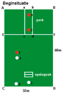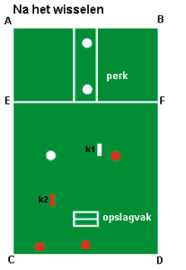 De opslagpartij gaat nu naar het perk en het perkpartuur moet nu opslaan.