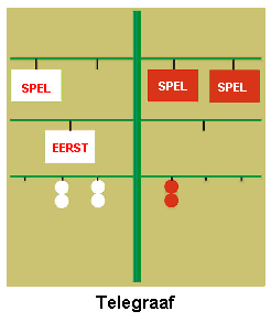 De stand op de afgebeelde telegraaf is 4 (twee spellen) tegen 3 (één spel en één eerst), en 2-4 voor de rode partij. Wie als eerste zes eersten (oftewel drie spellen) haalt, heeft de partij gewonnen. Eén wedstrijd duurt ongeveer 40 tot 50 minuten.